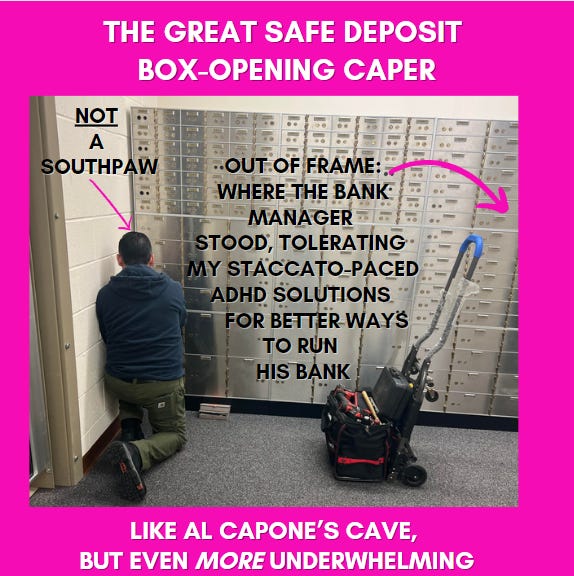 Today’s episode is THE GREAT SAFE DEPOSIT BOX CAPER. The gentleman pictured below was breaking open my safe deposit box this morning, because I lost the damned safe deposit box keys. AGAIN. For the second year in a row. More ADHD Taxes paid. Yes, I’ve had the notification letter from the bank since last fall, but, true to form, it took me until five days prior to an out-of-state move to finally muster enough panic to book the locksmith to drill it open. Procrastination adrenaline is what drives me.
